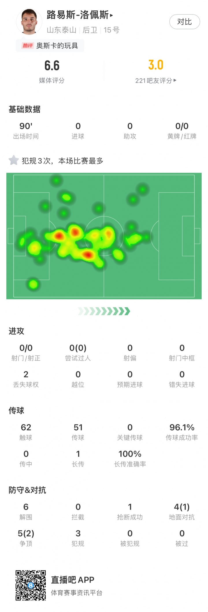 2025-10-05 00:18:31表现不佳!泰山中卫洛佩斯全场4次对抗1次成功,5次争顶2次成功