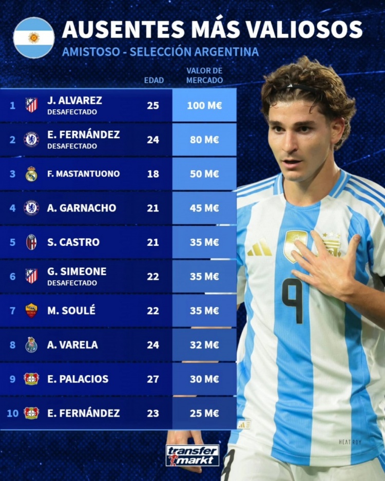2025-11-12 08:00:03缺席本期阿根廷队球员身价榜:小蜘蛛1亿欧居首,恩佐8000万欧