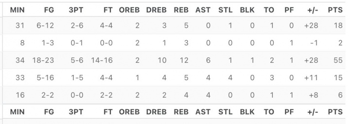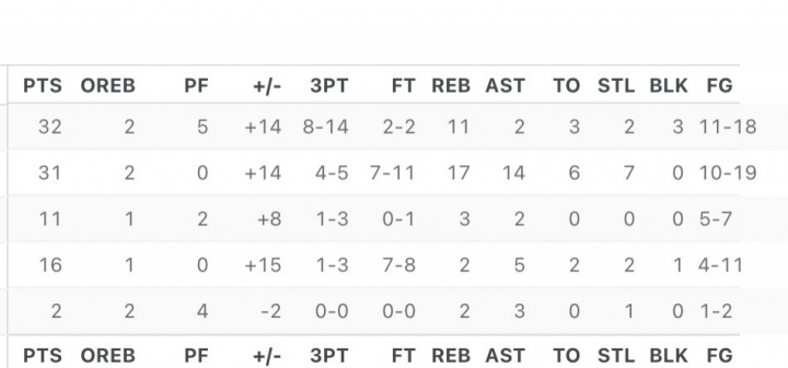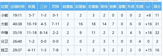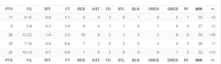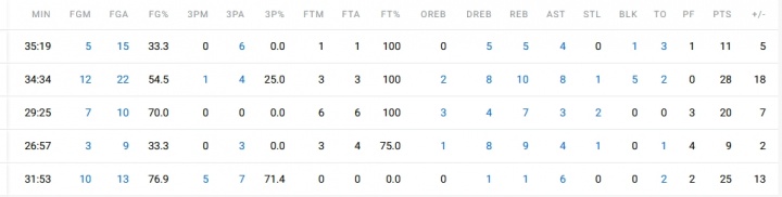 经典款数据统计栏如下图所示,ESPN原本的排列方式是与NBA官网基本保持一致的,这个设计源自纸质版数据统计栏。