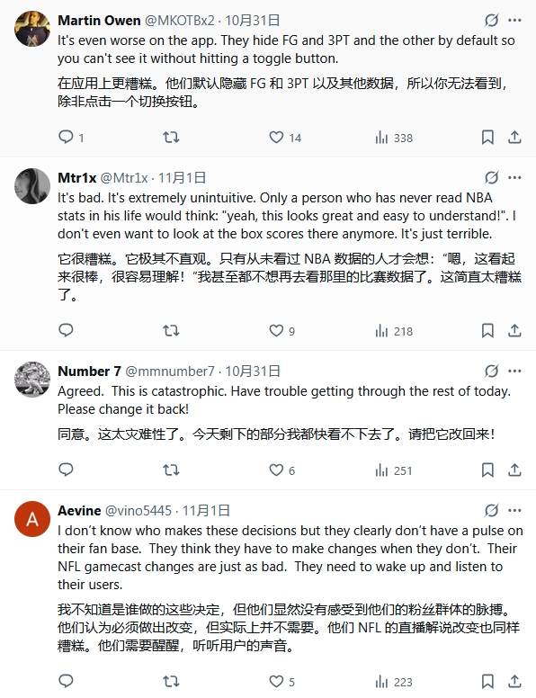 2025-11-14 16:09:32感觉不如直播吧~ESPN新版数据栏反人类设计令球迷抓狂 谁看谁难受