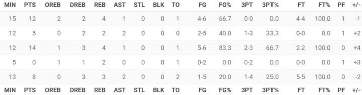 ESPN近期也回调了数据统计栏的部分设计(如下图所示),投篮相关数据被重新放回前几列,时间和得分依旧换了位置,失误被放在了助攻后面,最大的问题在于进攻篮板和防守篮板被放在了奇怪的地方。